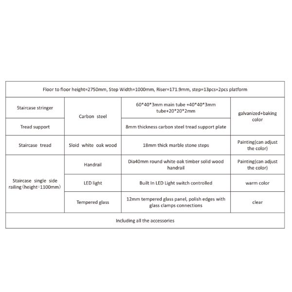 Tread: Carbon steel; stainless steel, solid wood; Glass.