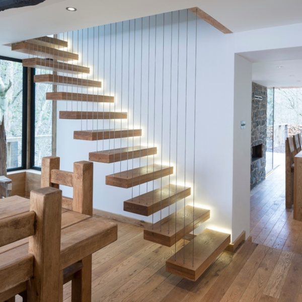 A sleek and contemporary floating staircase with durable cable railing, designed to enhance modern villa interiors with elegance and open-space aesthetics.